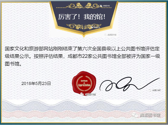 国家文化和旅游部网站刚刚结束了第六次全国县级以上公共图书馆评估定级结果公示。按照评估结果,成都市22家公共图书馆全部被评为国家一级图书馆。据了解,此次评估定级拟确定全国上等级公共图书馆共计2521个,其中,一级公共图书馆953个,二级公共图书馆501个,三级公共图书馆1067个。全国所有参评的直辖市及副省级以上城市公共图书馆中,仅北京(16个区县)、上海(16个区县)、宁波(10个区县)所辖...