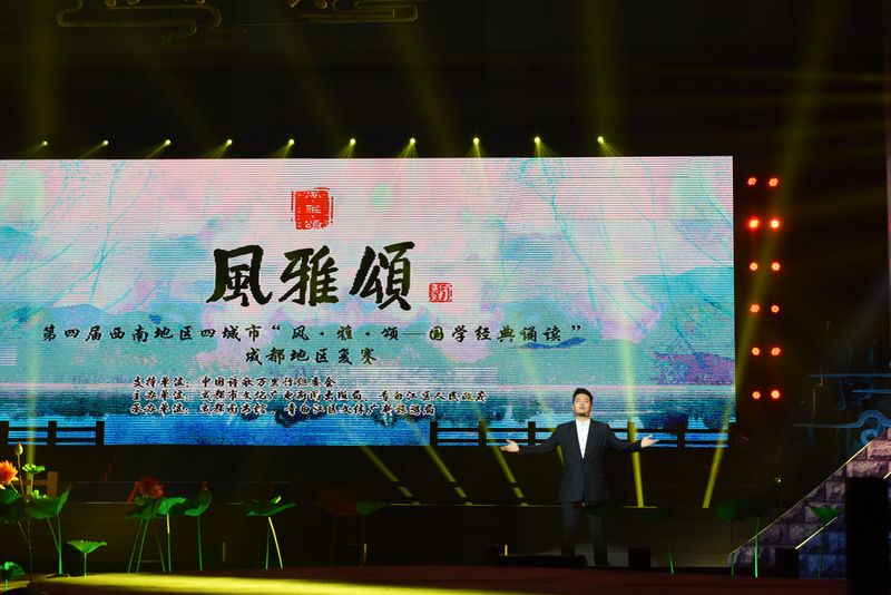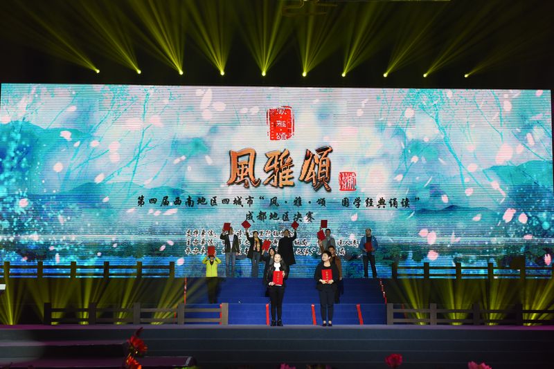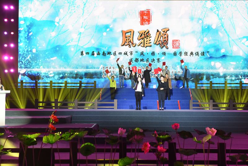 读经典颂国学,百家争鸣绚烂中华文脉;掀热潮展魅力,穿古越今复兴千年辉煌。11月4日,由中国诗歌万里行组委会指导,成都市文化广电新闻出版局和青白江区人民政府主办,成都图书馆、青白江区文体广新旅游局承办的西南地区四城市“风·雅·颂—国学经典诵读”成都地区决赛,在青白江区体育馆成功举办。来自成都分赛区的23只优秀队伍近100名选手悉数登场,和着古筝古琴意境深远的演奏,伴着青衣水袖激昂曼妙的配舞,以多种创新表现形式,将一首首国学经典演绎得如梦似幻,时空流转,不仅再次呈现了中华优秀文化的独特魅力,更为观众奉上了一场传统文化的饕餮盛宴。